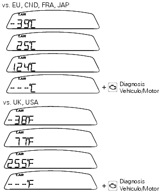 si el dato es igual o inferior a 9,9 Voltios se visualiza la inscripción “LO” destellante y se enciende el testigo “Diagnosis motor - EOBD” (8);