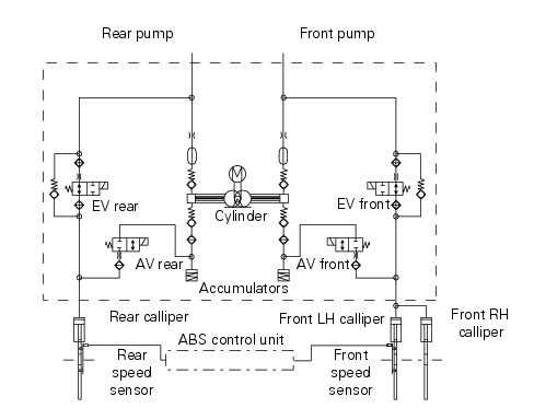 The hydraulic component of the ABS system consists of a primary circuit (from the cylinder to the control unit and from the control unit to the calliper) and a secondary circuit (completely within the control unit). The hydraulic layout of the ABS system is given below.